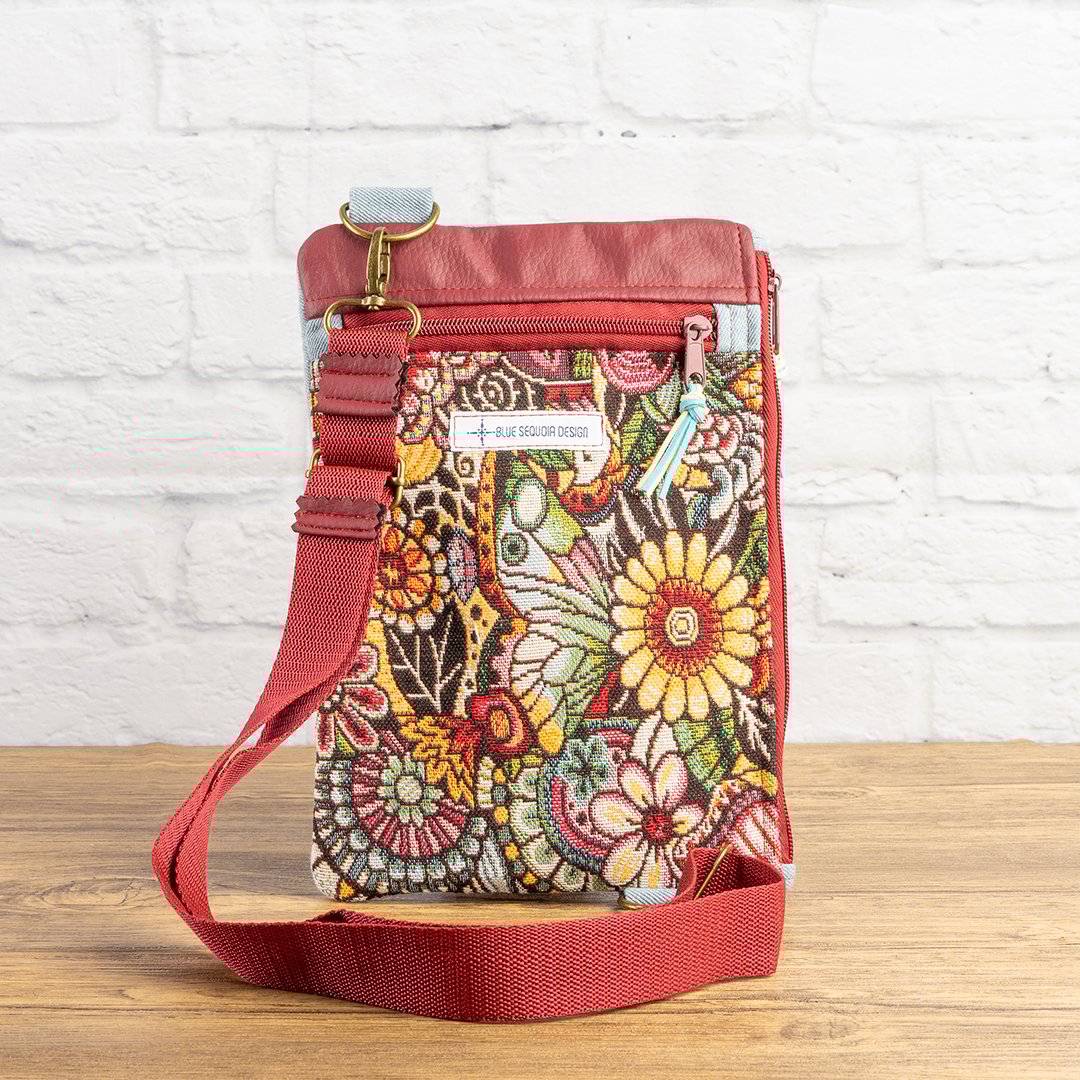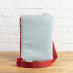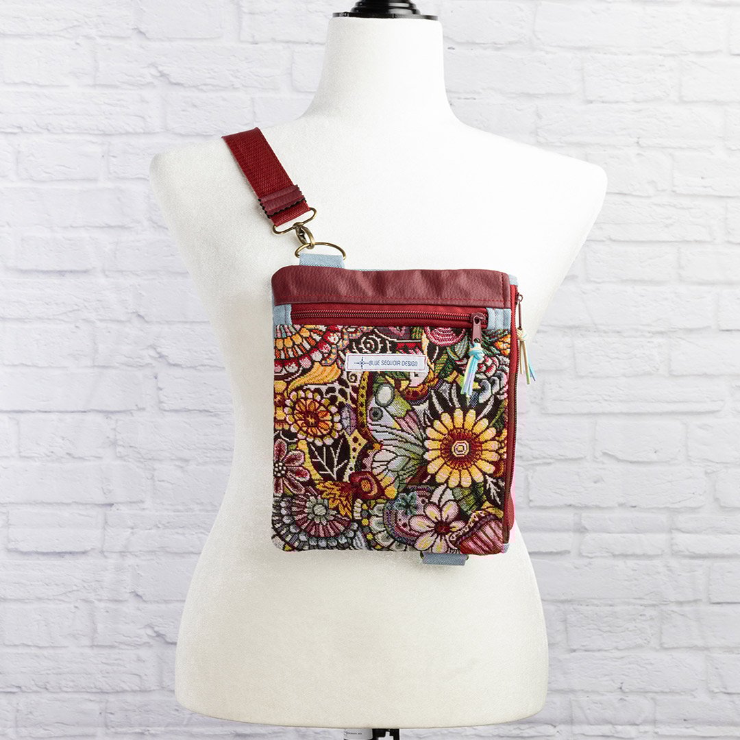 Bandolera cruzada confeccionada a mano por mí en gobelino y denim, con detalle de polipiel de tapicería en la parte superior. Es una pieza muy práctica para llevar lo imprescindible a salvo y siempre a mano: móvil, cartera, llaves, gafas, documentación o un pequeño cuaderno. Dispone de un bolsillo frontal con cremallera y un compartimento principal con apertura lateral hacia el lado derecho, también con cremallera, para que puedas acceder al interior de forma cómoda cuando la llevas cruzada.