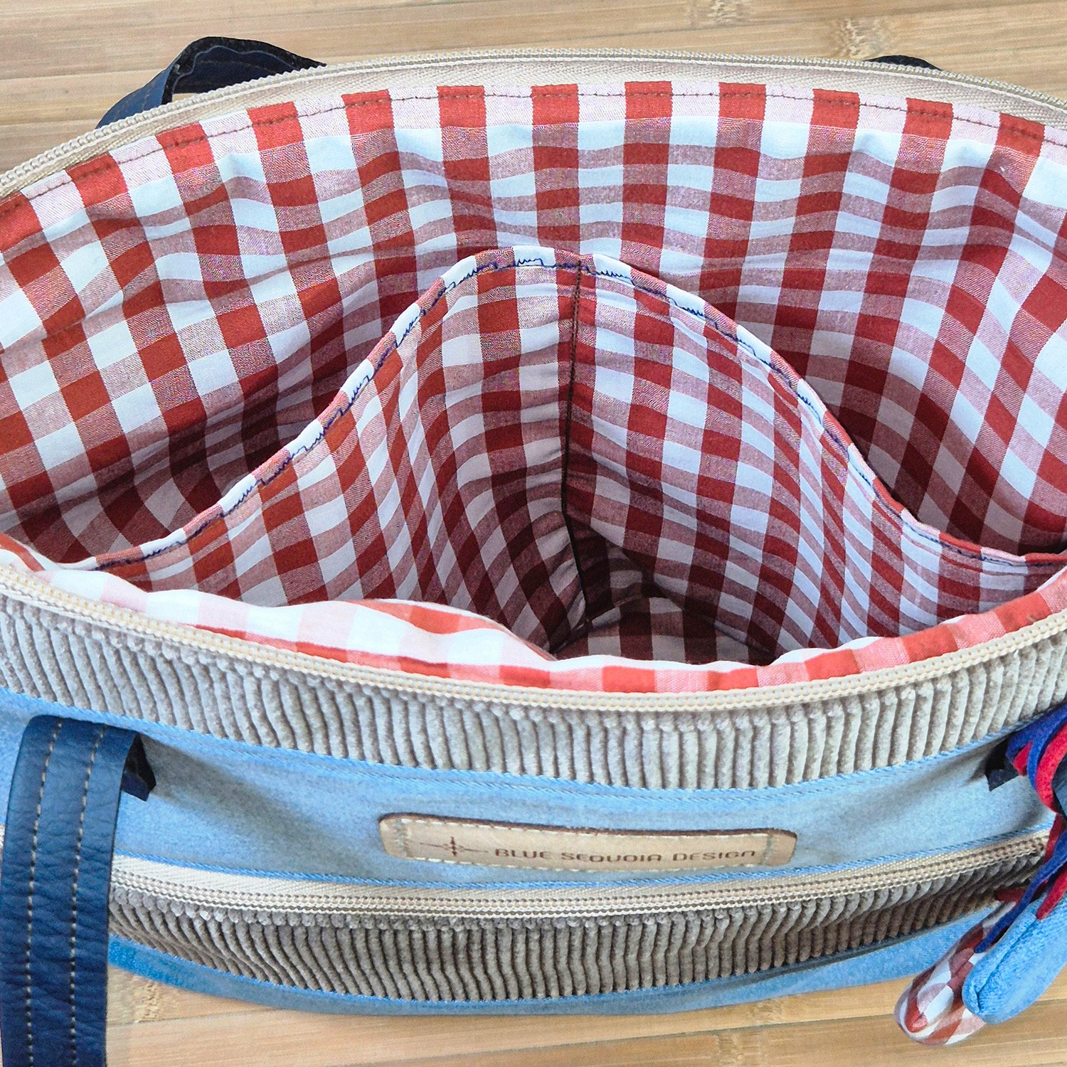Interior: tela 100 % algodón utilizada para el forro completo y los dos bolsillos interiores, en estampado vichy color teja, para que el interior resulte agradable al tacto y fácil de usar en el día a día.