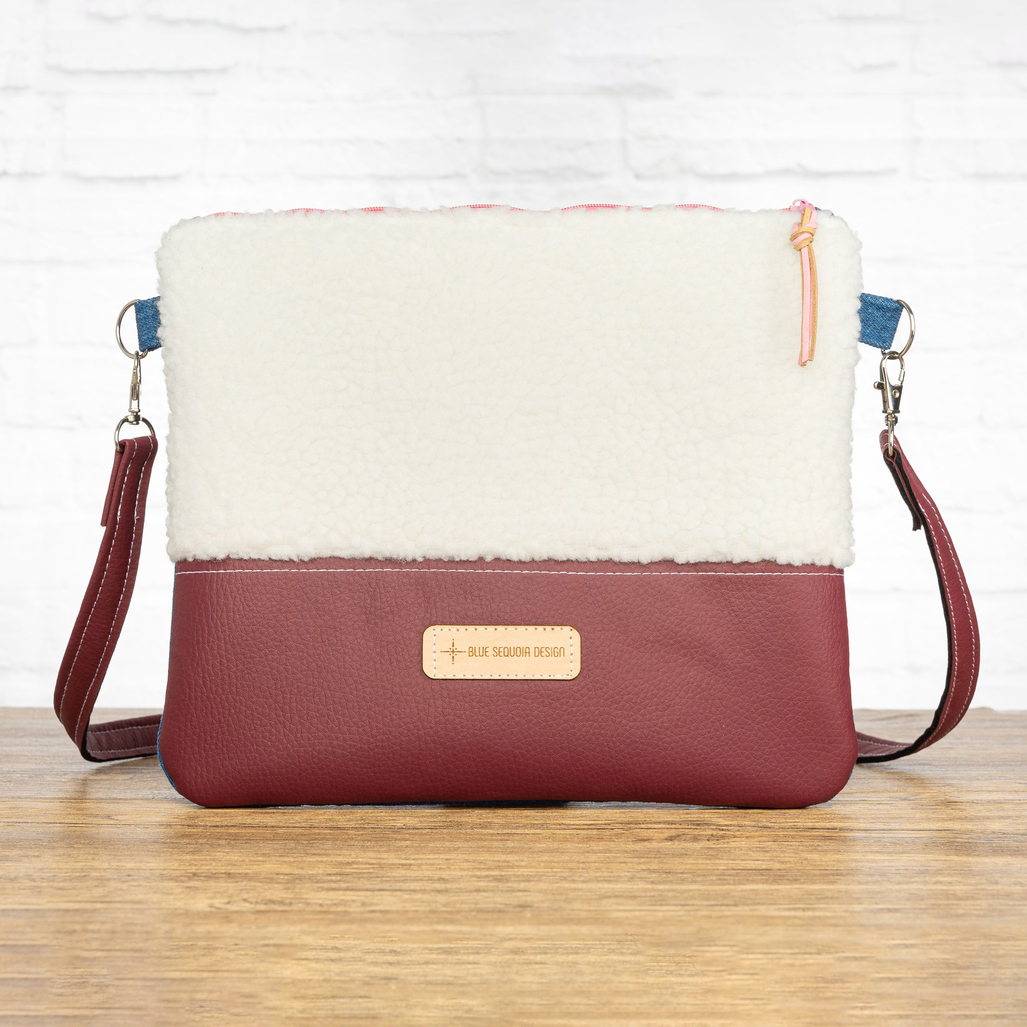 Un bolso ligero y muy cálido, pensado para acompañarte en otoño e invierno. La combinación de tejido teddy en color crudo, denim azul y polipiel de tapicería granate lo convierte en una pieza cómoda, suave al tacto y fácil de integrar en el día a día.