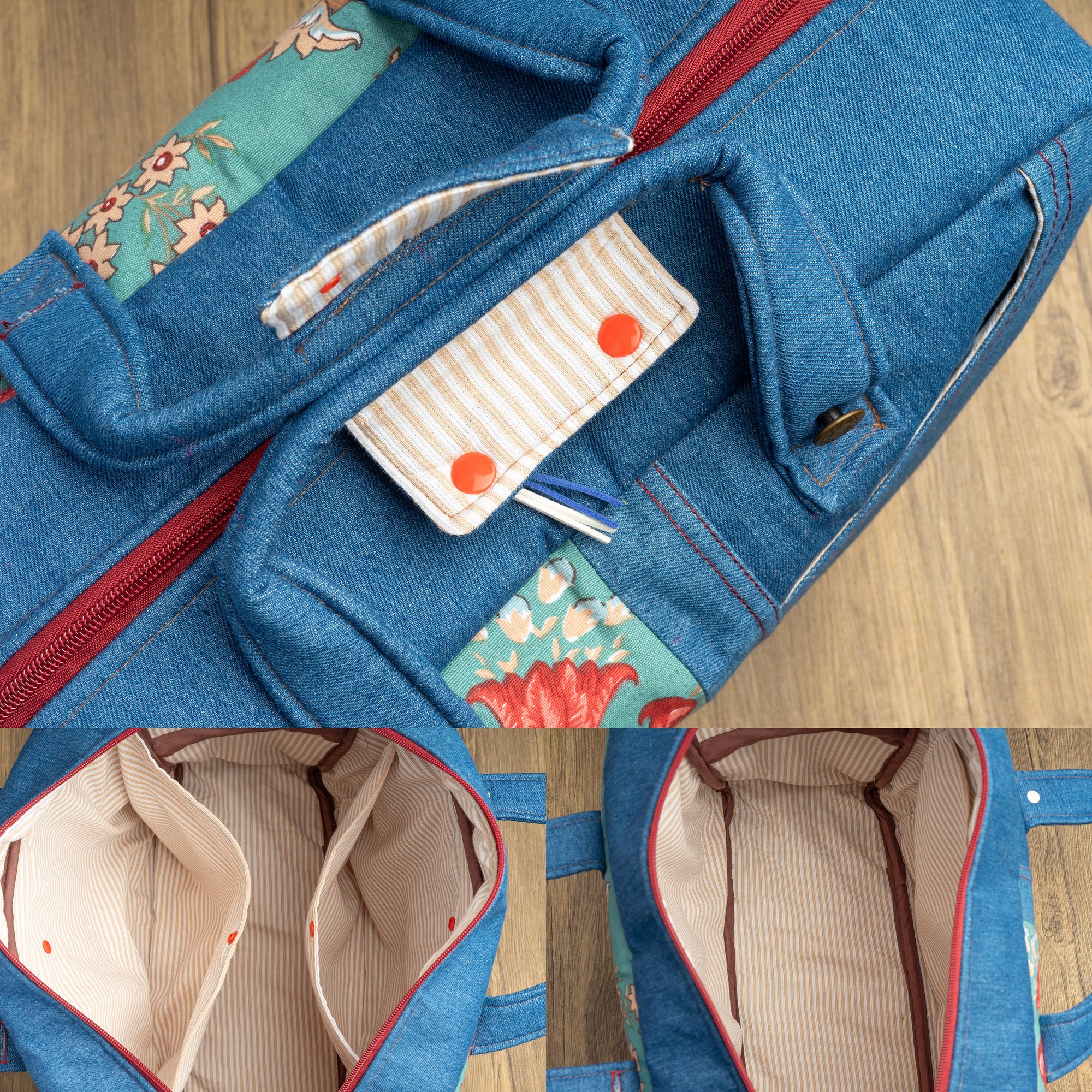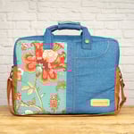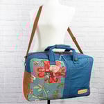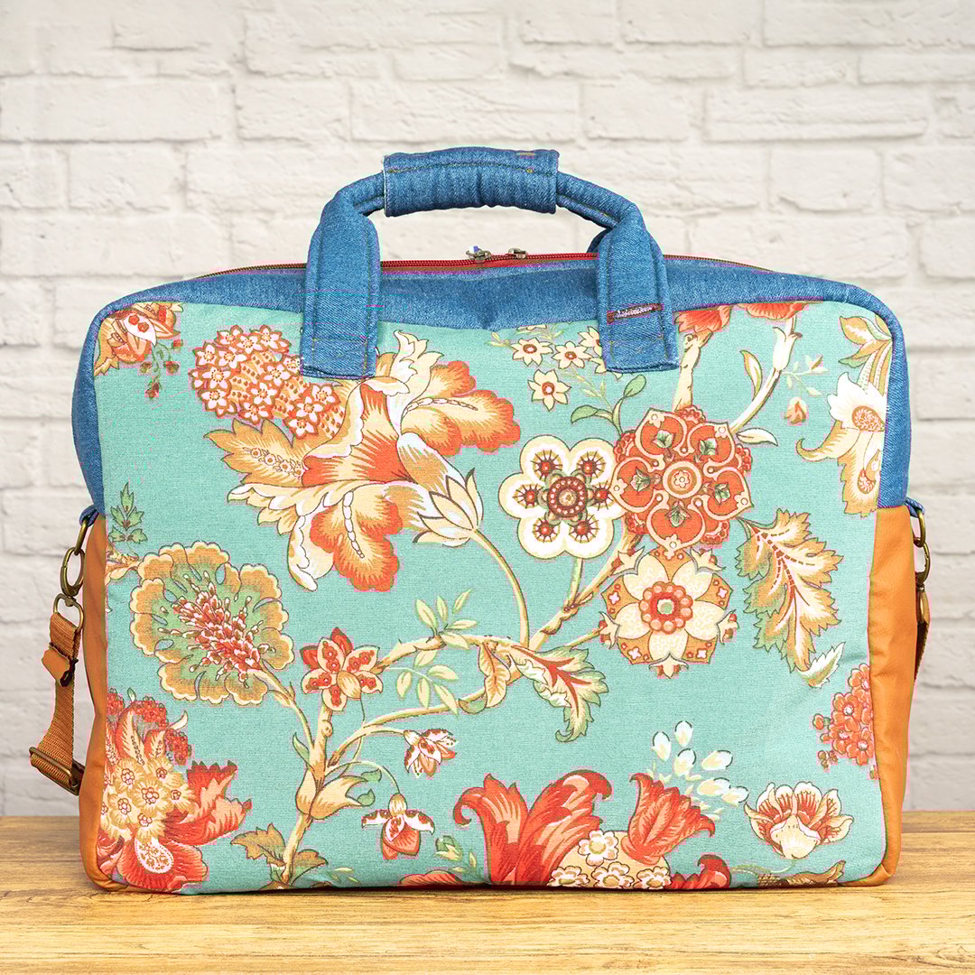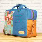 En el frontal, la loneta de flores en tonos cálidos se combina con el denim azul medio formando un bolsillo vaquero real, con la forma y las costuras de un bolsillo de pantalón, forrado por dentro con la misma tela de piqué de canutillo del interior de la maleta. La polipiel plus en color camel refuerza la parte inferior y los laterales, aportando contraste y mayor resistencia al roce. La parte trasera está realizada íntegramente en loneta estampada, para que la maleta se vea igual de especial por ambos lados. Puedes llevarla en la mano con sus asas cortas en denim, unidas por una pieza que se cierra alrededor de ambas para que resulten más cómodas al sujetarla, o colgada del hombro con la bandolera ajustable de cinta tipo mochila.