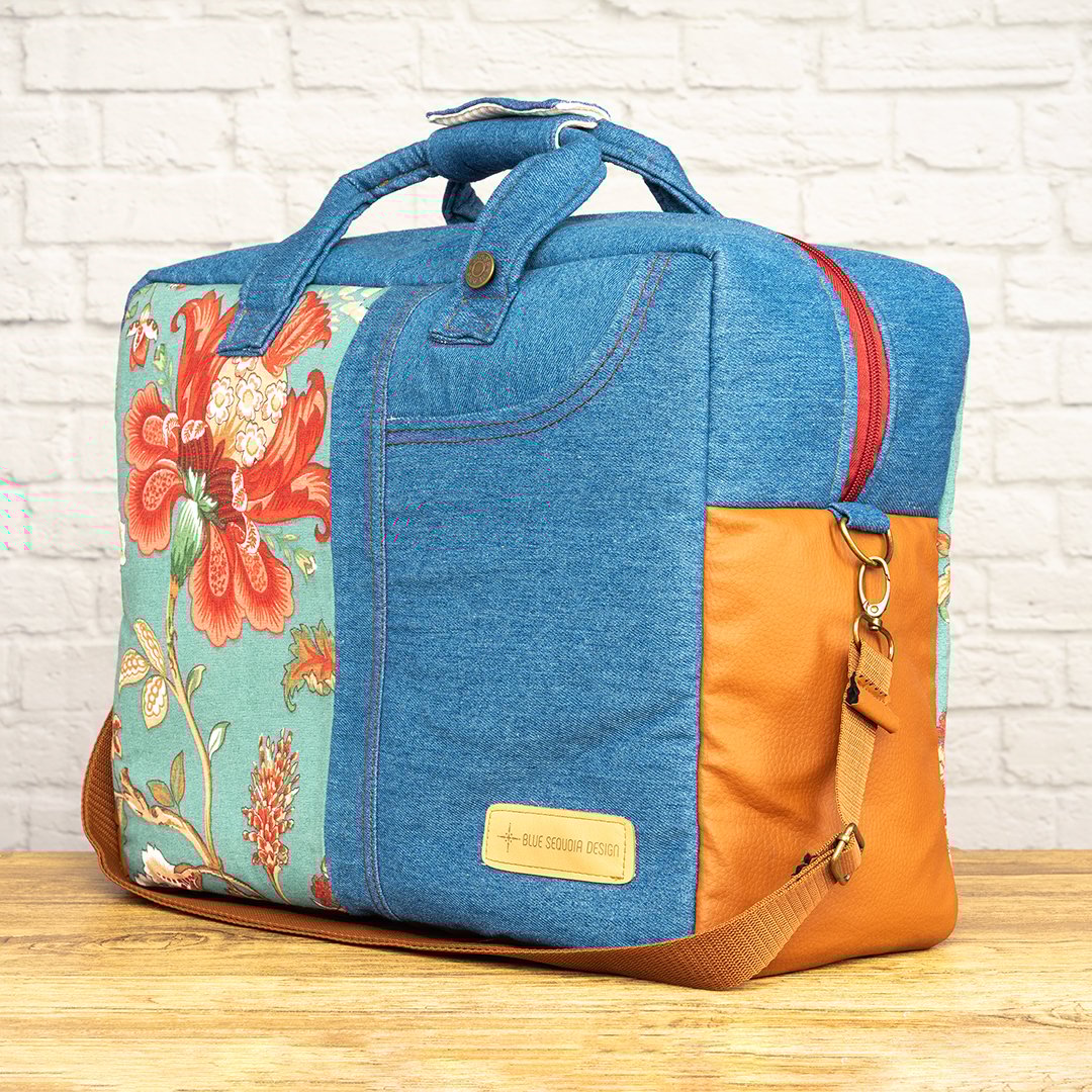 Bolsa de viaje confeccionada a mano por mí en denim azul medio y loneta estampada. Es una pieza versátil que puedes usar como maleta de fin de semana, como bolsa de trabajo o estudio y como compañera de escapadas cortas. Tiene capacidad para ropa, neceser, algo de abrigo ligero y tus básicos diarios, e incluye dos bolsillos interiores y un bolsillo exterior real en el frontal para ayudarte a organizar lo que llevas contigo.