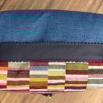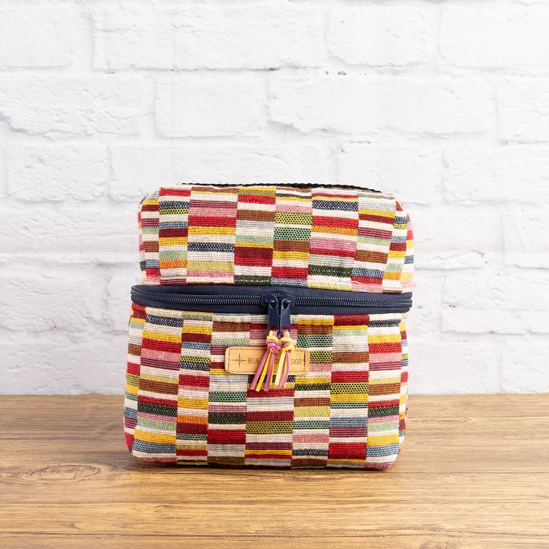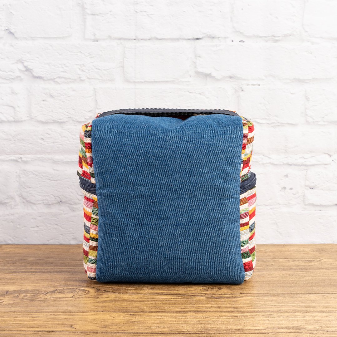 Neceser tipo caja confeccionado a mano por mí en gobelino multicolor y denim azul medio, con asa superior en polipiel de tapicería en color azul. Su forma cúbica y la estructura que aportan la entretela rígida y el estabilizador premium lo hacen perfecto para organizar cosmética, maquillaje, minitallas, cables o pequeños imprescindibles dentro de tu maleta o en el baño. En el interior cuenta con un bolsillo abierto para ayudarte a separar lo que quieras tener más localizado.