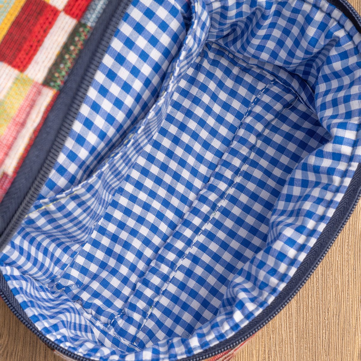 Tejido vichy de algodón y poliéster en tonos azul y blanco, utilizado para el forro completo del interior y el bolsillo.