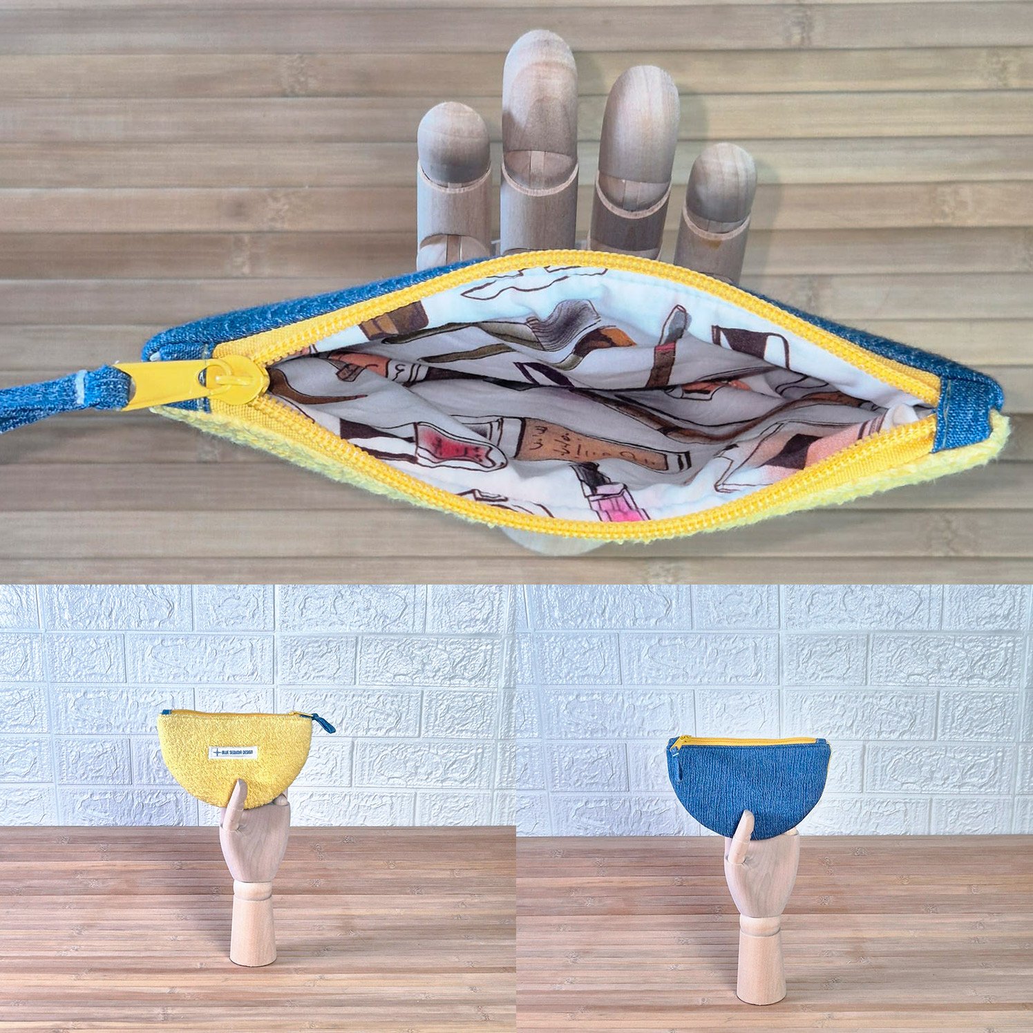 Todas las telas han sido previamente lavadas en el taller antes de su uso para la confección. Aun así, las telas denim pueden desteñir, especialmente en los primeros lavados, por lo que se recomienda no mezclar este neceser con otras prendas claras o utilizar un producto antitransferente si lo consideras necesario.